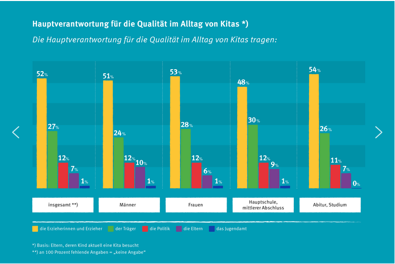 93 Prozent der befragten Mütter und Väter glauben, dass sich die Fachkräfte dafür einsetzen, dass die Qualität in den Einrichtungen gut ist und alle Kinder bestmöglich betreut und gefördert werden. Auf die Frage wer die Hauptverantwortung für die Qualität im Alltag von Kitas und Kindertagespflegeeinrichtungen trägt, zeigt sich ein deutliches Bild. Über die Hälfte der befragten Eltern (52 Prozent) sehen die Erzieherinnen und Erzieher in Kitas als Hauptverantwortliche, 27 Prozent schreiben die Verantwortung dem Träger zu und nur zwölf Prozent sehen die Politik in der Pflicht.