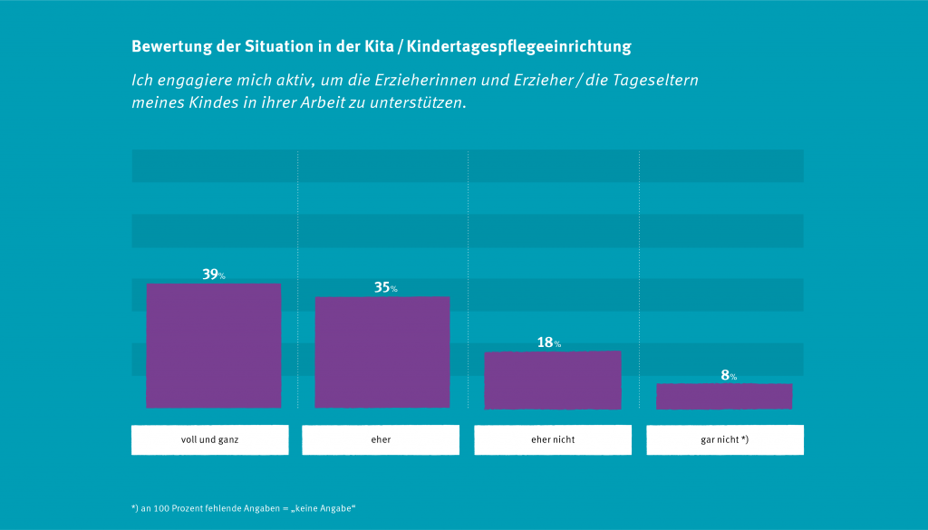 39 Prozent der befragten Eltern stimmen der Aussage „Ich engagiere mich aktiv, um die Erziehrinnen und Erzieher / die Tageseltern meiner Kinder in ihrer Arbeit zu unterstützen“ voll und ganz zu. Weitere 35 Prozent stimmen dieser Aussage tendenziell eher zu und nur acht Prozent engagieren sich gar nicht aktiv, um die Arbeit der Fachkräfte zu unterstützen. Zudem ist ein Großteil der Befragten mit den Möglichkeiten zur Mitsprache und Mitgestaltung in der Kita oder bei den Tageseltern zufrieden (82 Prozent).