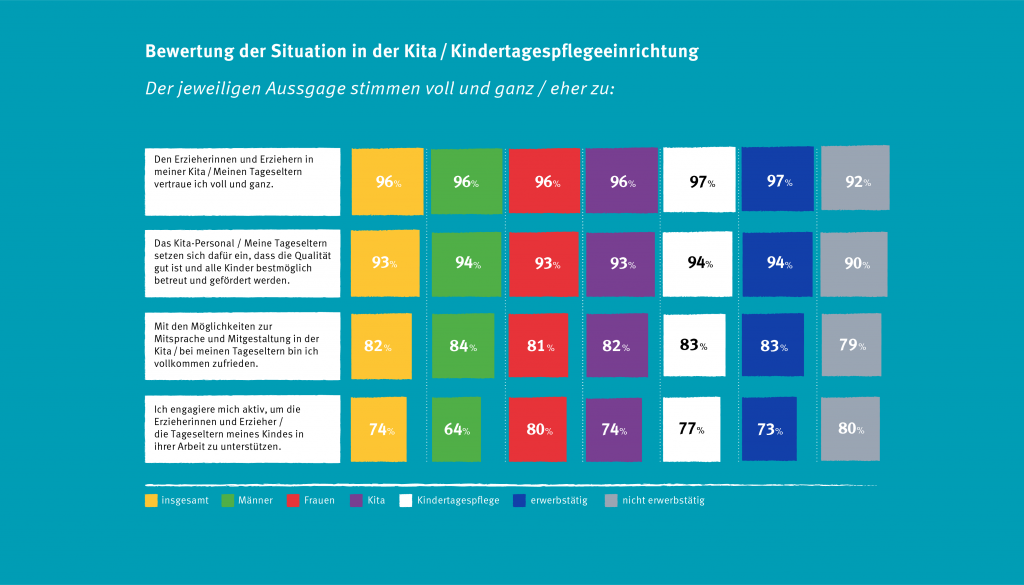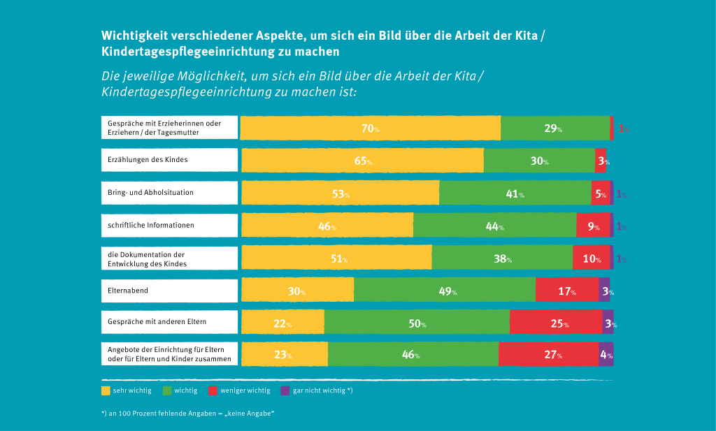 Nur ein Prozent der Eltern vertraut den Fachkräften in ihrer Kita beziehungsweise den Tageseltern gar nicht. Demgegenüber geben 67 Prozent der befragten Eltern an, dass sie der Tagesmutter, dem Tagesvater oder der Kita-Fachkraft voll und ganz vertrauen. Ein wichtiger Fakt – denn schließlich geben Eltern ihre Kinder jeden Morgen in die Obhut der Fachkräfte und dies zum überwiegenden Teil mit einem guten Gefühl.