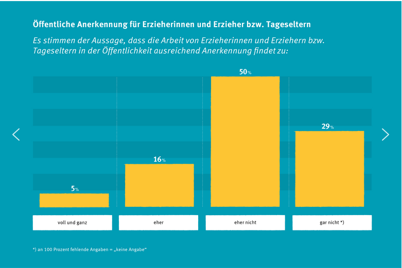 Die öffentliche Anerkennung der Arbeit von Kita-Fachkräften und Tageseltern schätzt ein Großteil der Befragten (79 Prozent) als zu gering ein. Nur fünf Prozent der Eltern finden, dass die Arbeit in der Öffentlichkeit ausreichend Wertschätzung erfährt.
